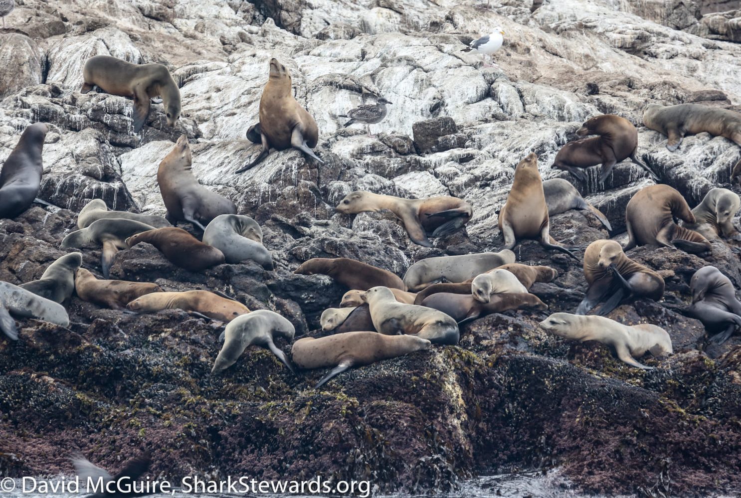The islands themselves are rich in history, both natural history and of human impact. Once the site of whales, seals and egging, until at last President Theodore Roosevelt protected the Fish and Wildlife system in 1909 as the Farallon National Wildlife Refuge was established to protect seabirds and marine mammals. The Refuge is comprised of four groups of small islands: Southeast Farallon, North Farallons, Middle Farallon, and Noonday Rock. South Farallon Islands is the largest island at 70 acres and was added to the refuge in 1969. The rocky precipices are now covered with thousands of nesting seabirds, seals and sealions and fur seals. During the fall months we call Sharktober, the waters are also visited by white sharks, here to feed following their annual migration from the central Pacific.