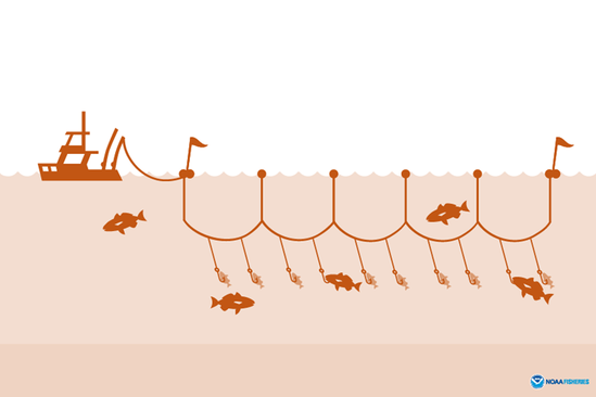 Targeting tuna, swordfish and other pelagic fish, longlines can stretch from a mile on smaller boats, to over 60 miles in an industrial vessel. On a large vessel thousands of baited hooks are set and left adrift for over 24 hours to several days. Longlines consist of a buoyed free- drifting mainline (also called a trunkline) with hundreds or even thousands of smaller lines (leaders) with baited hooks at the end. The leader is the part of the gear between the long or (trunk) line and the hook. The baited hooks also catch and kill albatross, sea turtles, pilot whales, Risso’s dolphins and bottlenose dolphins, and other species of sharks.