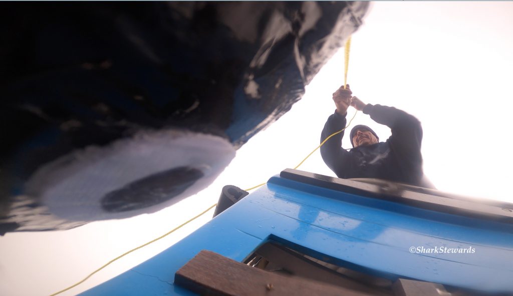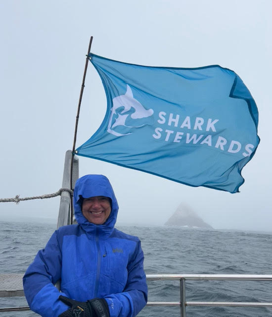Finally the island emerges from the low fog. We can hear the waves washing up the eroded cliffs before seeing the white wash. Above the surface, the craggy sea cliffs are also painted white from the excrement of a hundred thousand nesting seabirds. Skirting past the Great Murre Cave and around Saddle Rock we deploy Snuffy, our seal shaped decoy onto the surface of Mirounga Bay. The water is clear, perhaps the plankton is blown clear by the currents, and we can see the white granite blocks and sand peppered by red urchins fifty feet below. Permitted under NOAA’s White Shark Stewardship Project, we are charged with educating the public on shark conservation and the benefits of our Greater Farallones National Marine Sanctuary. Our excursions identify white sharks by their scars, markings and dorsal fin, allowing us to identify individuals, and provide the data to Stanford University’s TOPP program and the Sanctuary. Reviewing the footage later, we often see sharks not spotted by our guests, but in this case the water is too clear, and the sharks are not fooled.