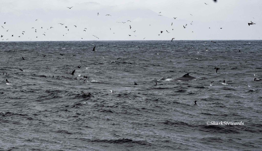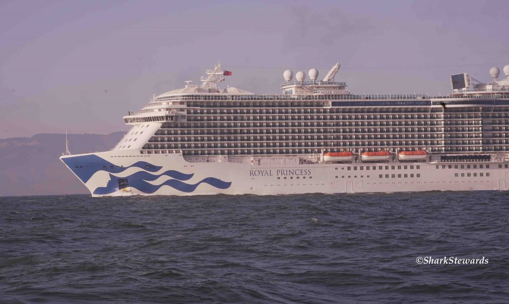 Humpback whales steam among the fish, spouts blowing in the wind as they forage in the waves. We find the whales often feeding in or close to the shipping lane. Each year as many as 200,000 ships enter and exit the Golden Gate, and according to the non-profit Point Blue Conservation Science, as many as 83 humpback, blue and fin whales are killed by ships on the West Coast. Because their bodies sink quickly, only a percentage are seen and reported, such as the 31 foot male that washed ashore at Fort Bragg last week. Because of this, NOAA and shipping companies have arrived at an agreement to reduce their speed below ten knots through the Sanctuary but the agreement is voluntary. Nearing the headlands a Princess liner steams like a huge white wedding cake building speed towards the whales. We hope the whales are able to avoid this and other ships steaming through our Sanctuary. The sun appears beneath the clouds as we at last turn back to shore, another successful adventure into our Greater Farallones National Marine Sanctuary.